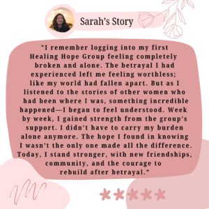 If you’ve been wounded by your husband’s sexual betrayal, you don’t have to walk this painful path alone. Our Healing Hope Groups are created specifically for women who are navigating the heartbreak of betrayal trauma and longing for restoration in Christ.